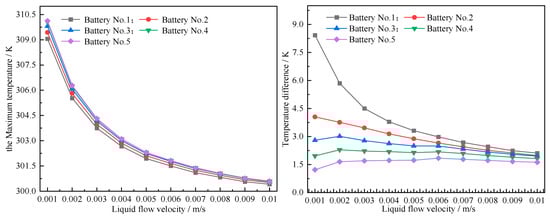 From these curves, clearly, the maximum temperature of each battery decreases as the liquid flow rate increases, with Battery 5 exhibiting the highest peak temperature. When the liquid flow rate starts from 0.001 m/s and gradually increases in a gradient of 0.001 m/s to 0.01 m/s, the highest temperatures of the 5th battery are 310.13 K, 306.29, 304.32, 303.11 K, 302.31 K, 301.5 K, 301.1 K, 300.83 K, 300.56 K, and 300.41 K, respectively, with a maximum difference of 9.72 K. The temperature difference in each battery varies at different flow rates, among which the temperature difference in the 3rd, 4th, and 5th batteries does not change much with the flow rate, while the temperature difference in the 1st and 2nd batteries decreases with the flow rate. The temperature difference in the 1st battery changes the most. An increase in the flow rate from 0.001 m/s to 0.01 m/s leads to a reduction in the temperature difference in the 1st battery, which decreases from 8.42 K to 2.11 K. Notably, during the initial stage of liquid flow rate adjustment, the temperature difference in Battery 5 tends to increase with the gradual rise in the liquid flow rate. This is because the liquid flows to Battery 5 after passing through Batteries 1, 2, 3, and 4 in the heat dissipation system. When the liquid flow reaches Battery 5, its temperature has obviously risen, resulting in a slightly poor heat dissipation effect on Battery 5. Especially when the liquid flow rate at the inlet is low (0.001 m/s), the liquid cooling effect on Battery 5 as a whole is relatively poor, making the temperature difference in Battery 5 itself low. Nevertheless, as the flow rate rises, the liquid cooling performance of Battery 5 improves gradually, with a slight increase in temperature difference. However, once the flow rate hits a certain threshold, any further increase will instead lead to a reduction in the temperature difference.