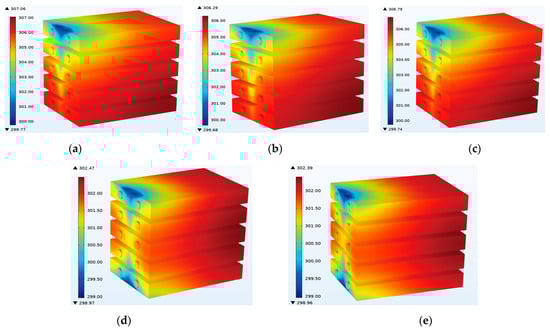 Cloud map of battery temperature at different inlet and outlet ports: (a) top left, top right; (b) top left, bottom right; (c) one inlet, two outlet; (d) two inlet, one outlet; (e) two inlet and two outlet.