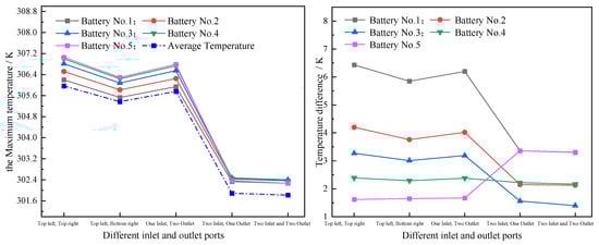 According to the temperature cloud maps of the batteries at different inlet–outlet ports, the lowest temperature in the first three schemes (upper left, upper right, upper left, lower right, and one inlet and two outlets) is concentrated at the inlet port in the upper left position. The higher the position to the right and lower, the higher the battery temperature; the latter two schemes (two in one out and two in two out) have the lowest temperature in the middle part of the upper left and lower left of the battery module. The further to the left middle or right, the higher the temperature. As shown in Figure 11, it is evident that the maximum temperature of Battery 1 is the lowest across all schemes, and the maximum temperature increases with an increase in the battery serial number. Therefore, Battery 5 has the maximum temperature; horizontally comparing the five different schemes, the highest temperature generated by the upper left and upper right scheme was 307.06 K, while the lowest temperature generated by the two in and two out scheme was 302.39 K. Of course, although the highest temperature of the two in and one out scheme was higher than that of the two in and two out scheme, the ratio was relatively close, with a difference of 0.08 K. From the average temperature, it can also be clearly seen that the two in and two out scheme produced the lowest average temperature, which was 301.82 K. From the temperature difference changes, the temperature difference in the first three schemes (upper left and upper right, upper left and lower right, and one in and two out) decreased from Battery 1 to Battery 5, with Battery 1 having the largest temperature difference, reaching 6.4 K. At 3 K, the temperature difference between Battery 1 and Battery 5 and Battery 2 and Battery 4 in the two in one out and two in two out schemes is relatively close, with Battery 3 having the smallest temperature difference. Among them, the temperature difference in the two in two out scheme is the smallest, at 1.4 K.
