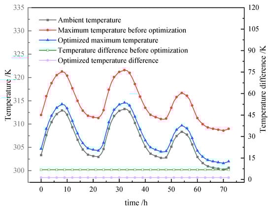 According to meteorological data, the highest temperature in Guangzhou city on 22 July and 3 August 2024 was the highest of the year, reaching 40.1 °C, or 313.25 K. Due to the highest average temperature in July of the year, the temperature for three consecutive days of 72 h from 6:00 am on 21 July to 6:00 am on 24 July 2024 was taken as the ambient temperature. The analysis and comparison showed the cooling effect of the battery module before and after optimization during a 3C discharge. As shown in Figure 12, the black curve in the middle represents the hourly ambient temperature for the hottest three consecutive days in July 2024. Variations in the ambient temperature led to changes in the highest temperature; its trend is consistent with the change in ambient temperature. The bottom two curves show the temperature difference before and after optimization. After 72 consecutive hours, the temperature difference remains almost unchanged, so the ambient temperature does not play a decisive role in the temperature difference change.