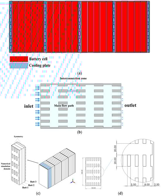 The straight-channel cooling plate design consists of seven rectangular channels, each 8 mm wide, 3 mm high, with a 5.5 mm spacing between channels. The module design and geometry, as shown in Figure 1a, is identical to the study by Liu et al. [15] and serves as the baseline for validating the present model and comparing the seven proposed designs. The interconnected modification being proposed in this study is explained diagrammatically and shown in Figure 1d.