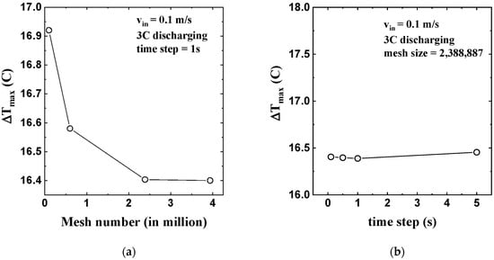 Figure 2 presents the grid independence test for the interconnected channel cold plate design with a constant inlet velocity of . The number of mesh elements varies between 800,000 and 4,000,000 with equal time step of 1 s. Figure 2a shows that the predicted maximum battery temperature rise (∆Tmax) remains nearly unchanged beyond the mesh size of 2,000,000. Similarly, in Figure 2b the effect of time-step sizes was studied, varying between 0.1 s and 5 s. Four cases have been conducted at time steps of 0.1 s, 0.5 s, 1 s, and 5 s. In this trial, the predicted (∆Tmax) is not significantly influenced for the time step of 1 s and above. Hence, in this study, the total number of mesh elements for the interconnected design was set to 2,000,000, with a time step of 1 s.