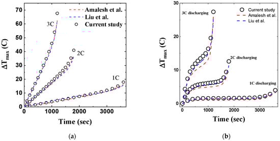 Figure 3a shows the transient maximum temperature rise in the battery module at different discharge rates (1C, 2C, and 3C) under adiabatic conditions. Consistent with the findings of Liu et al. [15], the results indicate that temperature increases with the increase in discharge rate. At a discharge rate of 3C, the maximum temperature rise is around 62 °C, whereas for 1C and 2C discharge rates, the observed maximum temperature rise was 36 °C and 16 °C, respectively. At a 3C discharge rate, the temperature increases linearly for the first 1000 s and then rises sharply afterward. A similar trend is also observed at discharge rates of 2C and 1C, where the temperature rise remains linear up to 1500 s and 3200 s, respectively. Figure 3a shows a sharp turning point when the battery is near the stage of EOD (end of discharge) as the internal resistance of the battery increases.