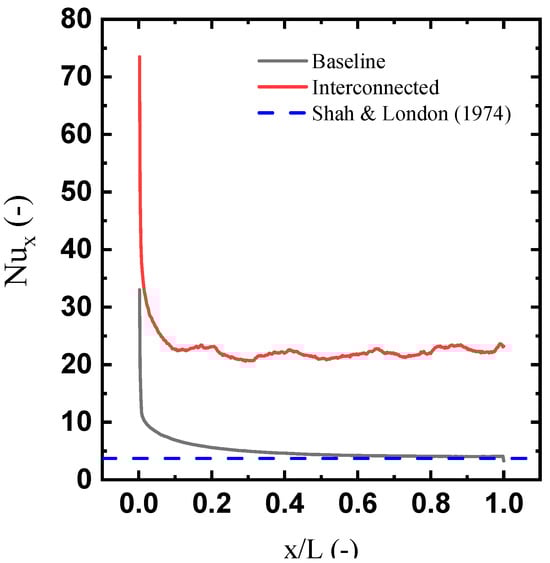 Streamwise variation in local Nusselt number for both baseline design and interconnected design compared with Shah and London [37].