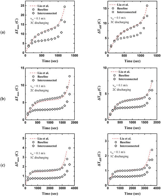 The thermal performance of the baseline and interconnected designs was evaluated by analyzing maximum temperature rise and temperature difference using Equation (12) and Equation (13), respectively. The evaluation results are shown in Figure 5. For maximum temperature rise (Figure 5a-left), the baseline and interconnected designs start to show a noticeable difference at 100 s. At this point, the interconnected design is preferable, with a temperature 0.5 °C lower than the baseline. At the end of discharge, the interconnected design achieved a maximum temperature 8 °C lower than the baseline design. This achievement is important, considering that the aging rate of Li-ion batteries increases when operating at higher temperatures [26]. For temperature uniformity (Figure 5a-right), the difference between the two designs starts to appear beyond 200 s. The effect of the optimized interconnected design becomes stronger as discharge time exceeds 200 s. By the end of the 3C discharge cycle, the interconnected design improves temperature uniformity by approximately 3.5 °C.