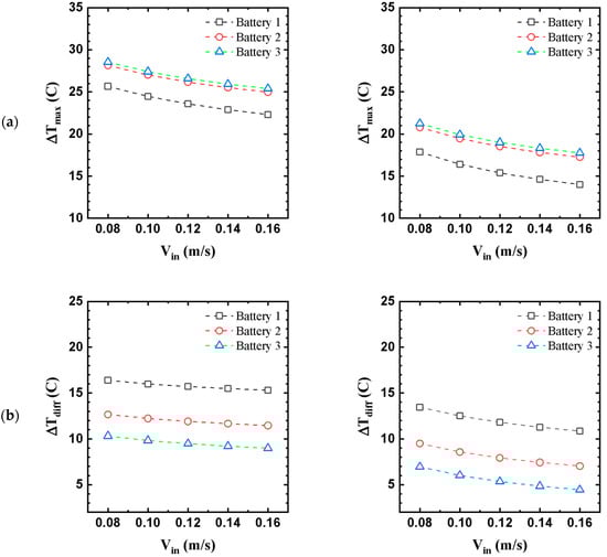 In addition to the maximum temperature rise (∆Tmax), variations in ∆Tdiff for each battery under different velocities are evaluated and shown in Figure 6b. The evaluation of temperature uniformity of different batteries is also important to evaluate since it affects efficiency and lifespan [25]. Consistent with previous findings, Figure 6b-right shows the ∆Tdiff of interconnected design has lower ∆Tdiff compared to baseline design in Figure 6b-left. This implies that proposed design also improves the uniformity of the battery to the level of each individual battery.