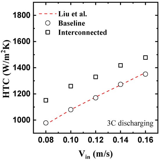 Figure 7 shows the variation in the average heat-transfer coefficient (HTC) with coolant velocity for the proposed interconnected (ID) plate and the baseline design of Liu et al. [15]. As the inlet velocity increases from 0.08 to 0.16 m·s−1, both designs exhibit a monotonic rise in HTC, reflecting the expected convective enhancement with thinner boundary layers at higher flow rates. The ID plate achieves an overall ≈ 17% higher HTC than the baseline, confirming that the introduced interconnections promote additional lateral mixing and local turbulence. However, the relative improvement becomes slightly smaller at higher velocities, suggesting that the advantage of the interconnection structure is more pronounced under low-flow conditions, where it effectively compensates for weaker natural convection and limited axial mixing.