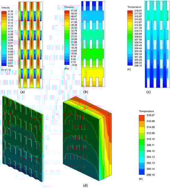 Velocity (a), pressure (b) and temperature contour along channel (c) and temperature contour on the battery body (d) under interconnected design.