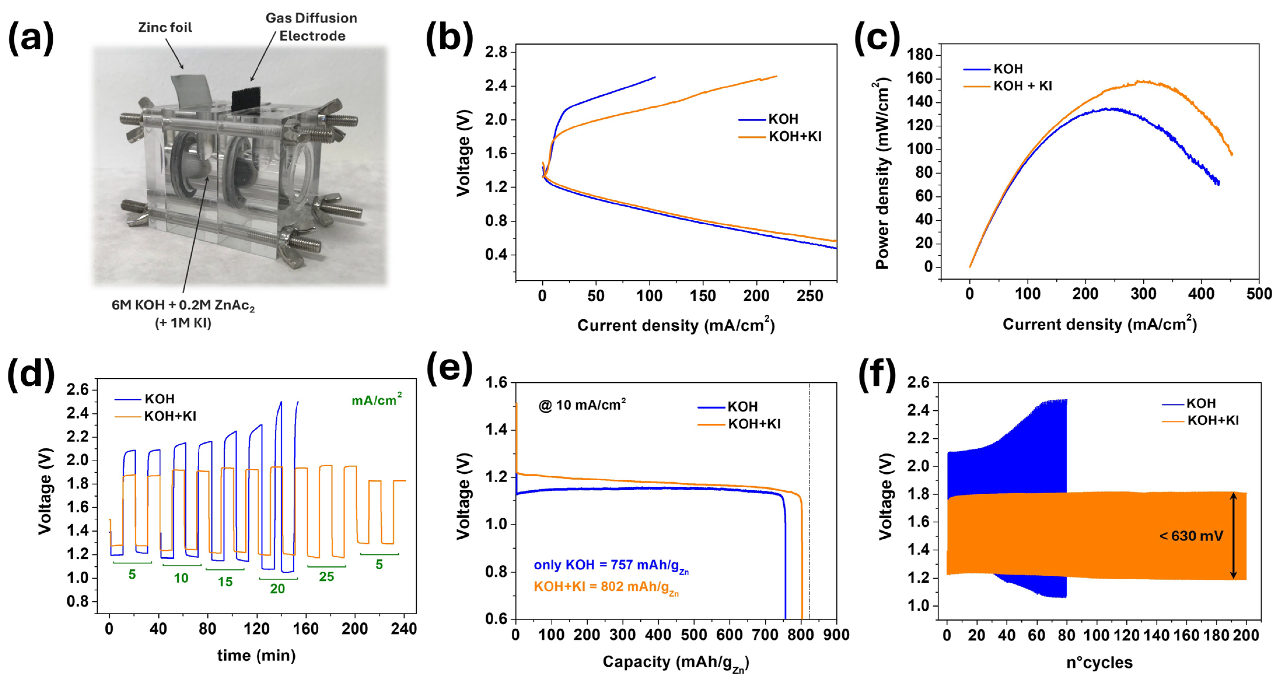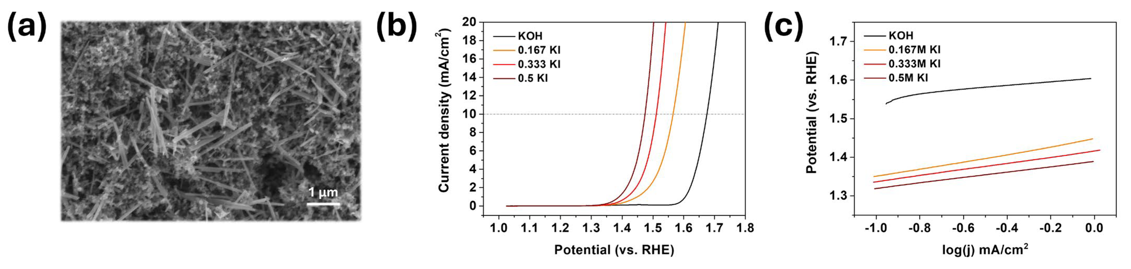 - Zou, X.; Lu, Q.; Wu, L.; Zhang, K.; Tang, M.; Xie, H.; Zhang, X.; Shao, Z.; An, L. I3−-Mediated Oxygen Evolution Activities to Boost Rechargeable Zinc-Air Battery Performance with Low Charging Voltage and Long Cycling Life. Angew. Chem.-Int. Ed. 2025, 64, 202416235. [Google Scholar] [CrossRef]