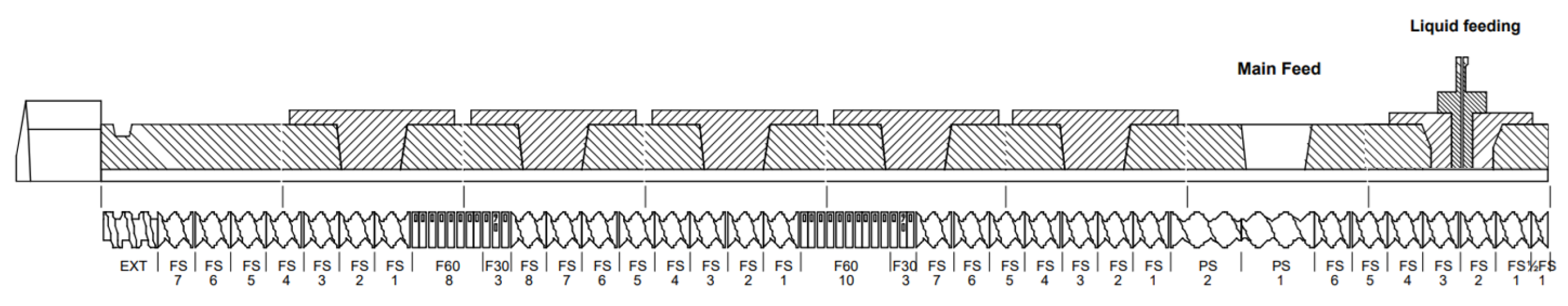 Figure 6a illustrates the double screw geometry used immediately after processing the anode slurry formulation. The black slurry can clearly be seen distributed along the screw, particularly in the kneading elements and in the last section of the conveyor elements before discharge.