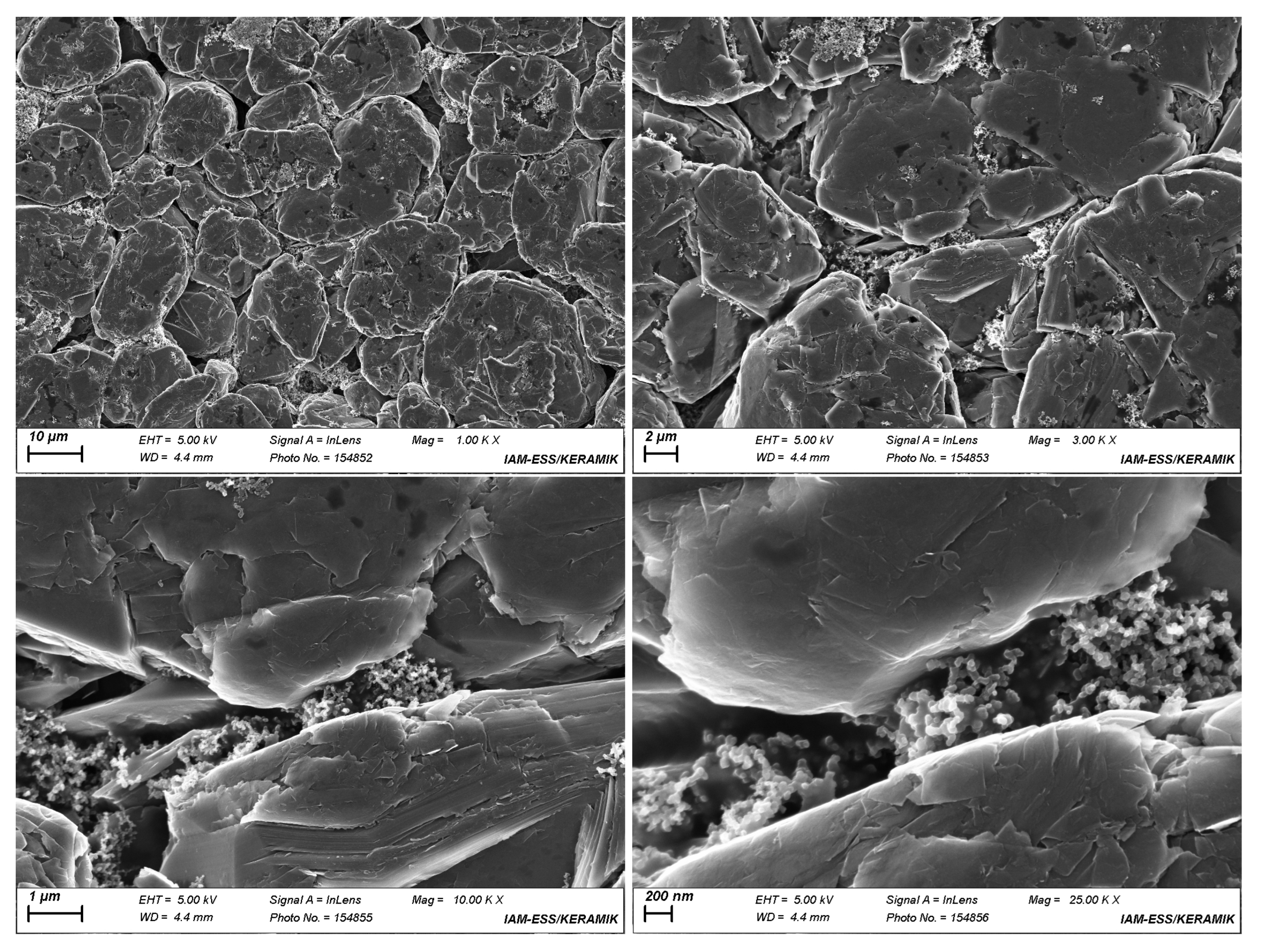Figure 4. The active material graphite and the conductive carbon black binder network are clearly visible in all images. The SEM micrographs at different magnifications reveal the characteristic microstructure of the graphite-based anode. At low magnification, large platelet-like graphite particles with irregular edges can be clearly identified. The particles are relatively densely packed but still exhibit interparticle voids. With higher magnification, the layered morphology of the graphite becomes more apparent, and the interfaces between adjacent particles are visible.