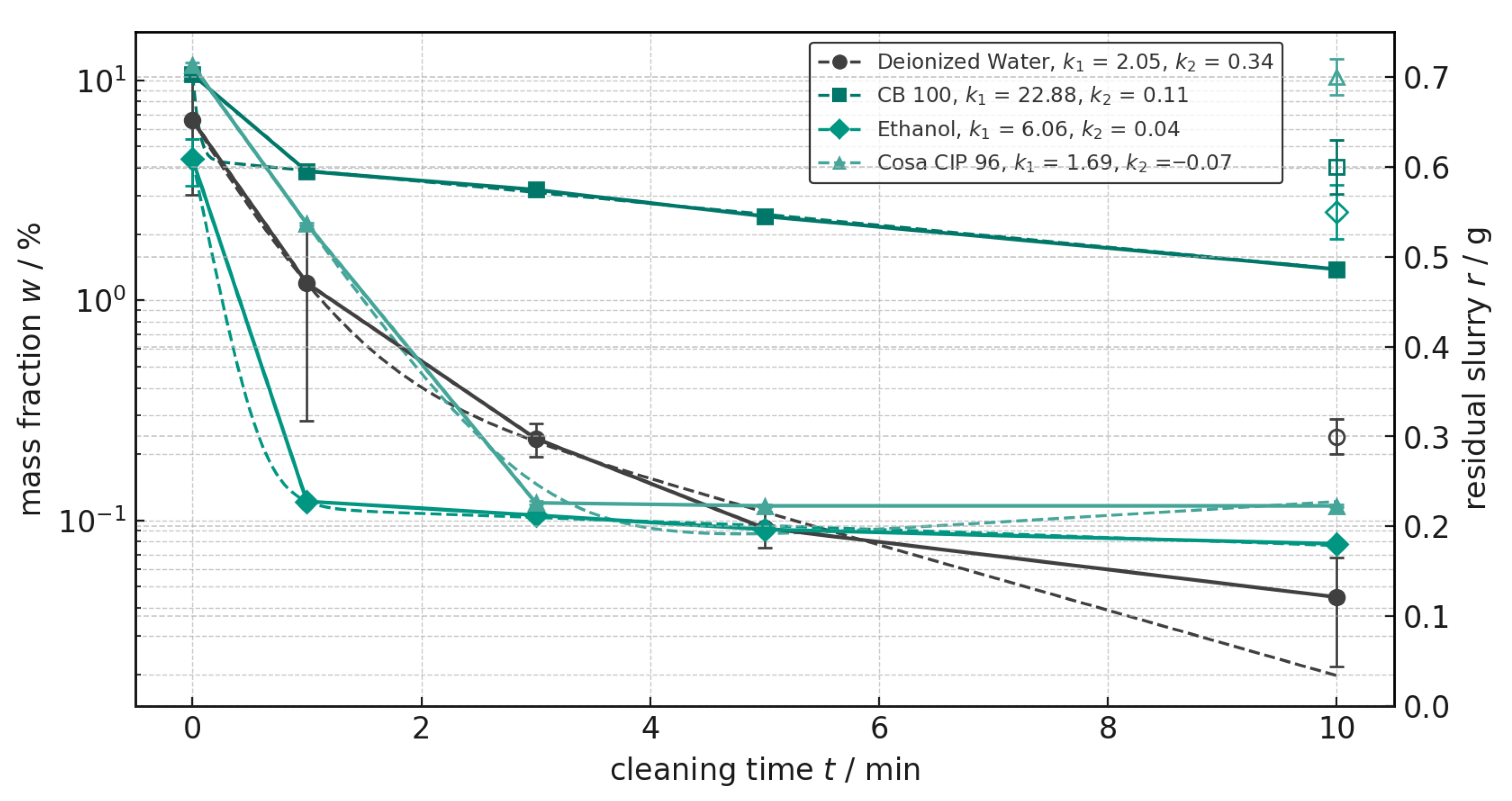 2) describes a rapid initial reduction associated with the direct displacement effect resulting from the flow of the cleaning agent and directly rinsable residues of the suspension. The second term represents a significantly slower decrease corresponding to the removal of residual adhesions or hard-to-reach contaminants. This allows cleaning processes to be compared under identical conditions with regard to cleaning kinetics.