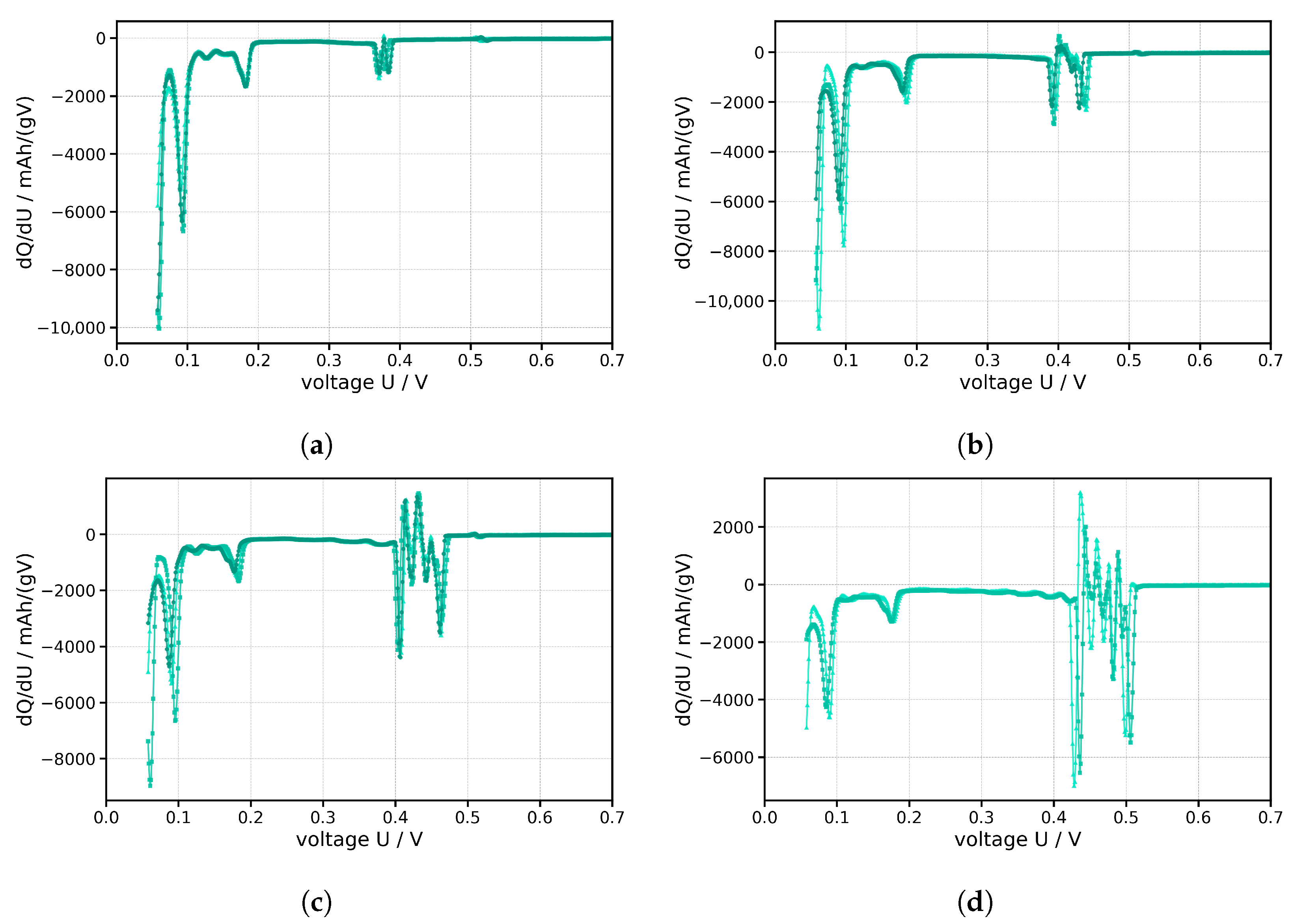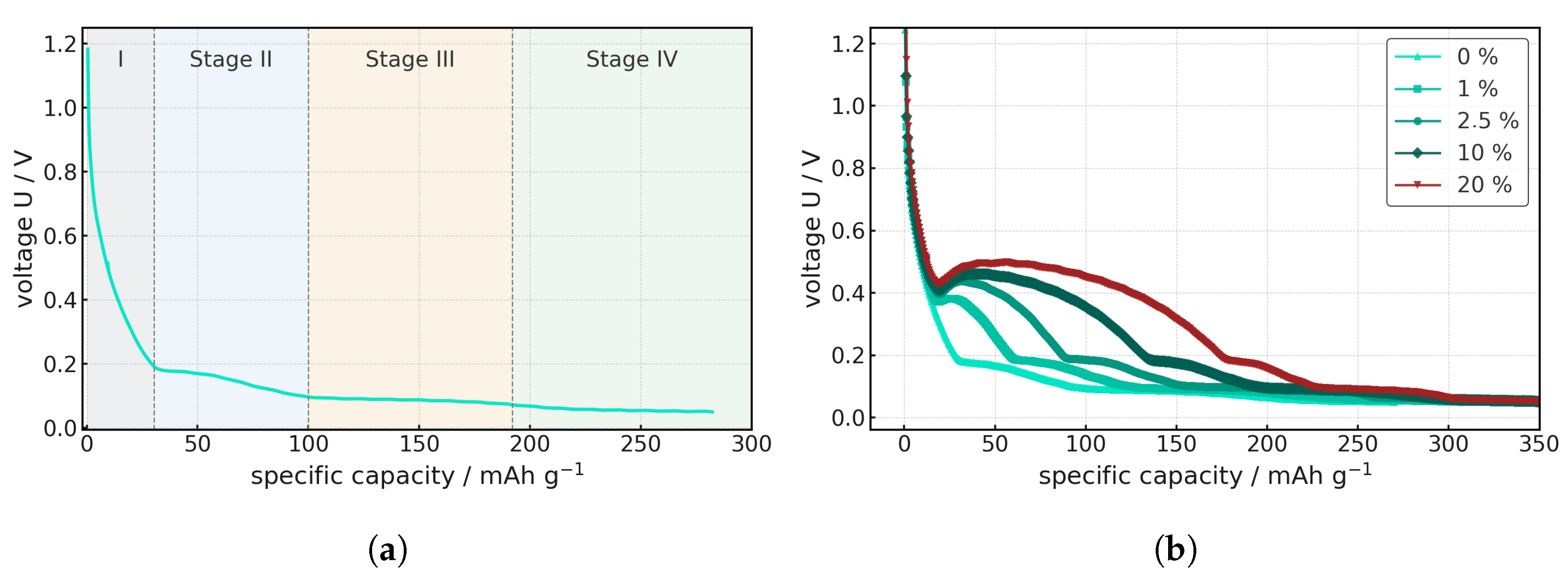 Figure 11a shows the voltage curve as a function of specific capacity during the discharge of an anode half-cell. These describe the intercalation processes during delithiation and can be divided into four characteristic stages that correspond to the well-known staging sequence already described in previous studies: LiC