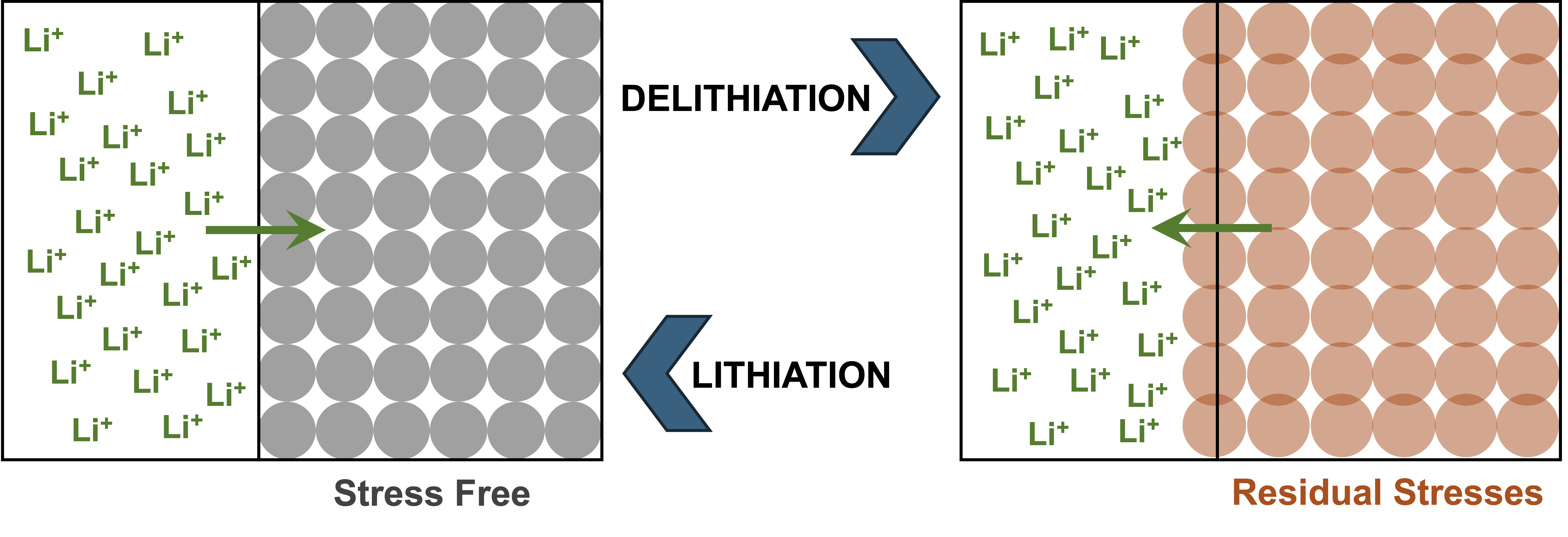 During the lithiation step, Vegard-induced lattice expansion causes individual active material particles to swell. In the constrained cathode microstructure, in-plane deformation is restricted by neighboring particles and by the current collector, preventing free volumetric dilation and generating high compressive internal stresses at particle contacts. Once these stresses exceed the effective yield strength, inelastic densification occurs, creating an irreversible plastic strain. During subsequent delithiation, the chemical strain vanishes as lithium leaves the lattice, but the plastic strain remains as an eigenstrain field. This retained eigenstrain acts as a source term for the residual in-plane stress distribution in the lithium-free state, representing the fundamental mechanism of eigenstrain-driven degradation resolved by the analytical framework.