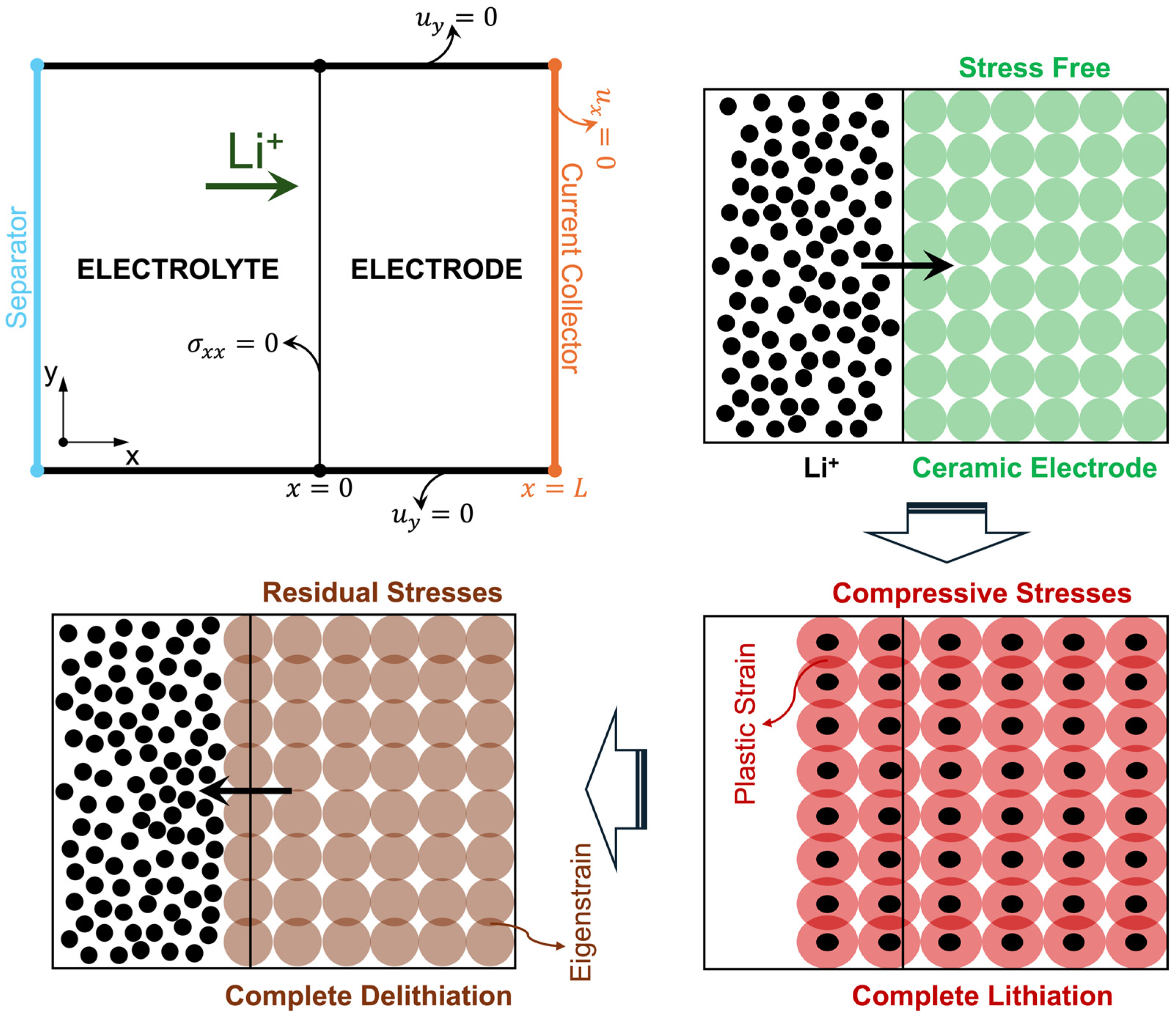 L. The remaining panels illustrate the corresponding particle-scale states during a single lithiation-delithiation cycle where an initial stress-free state, a lithiated state with constrained expansion and plastic compaction, and a delithiated state with retained eigenstrain and residual stress. In the upper-left panel, the condition