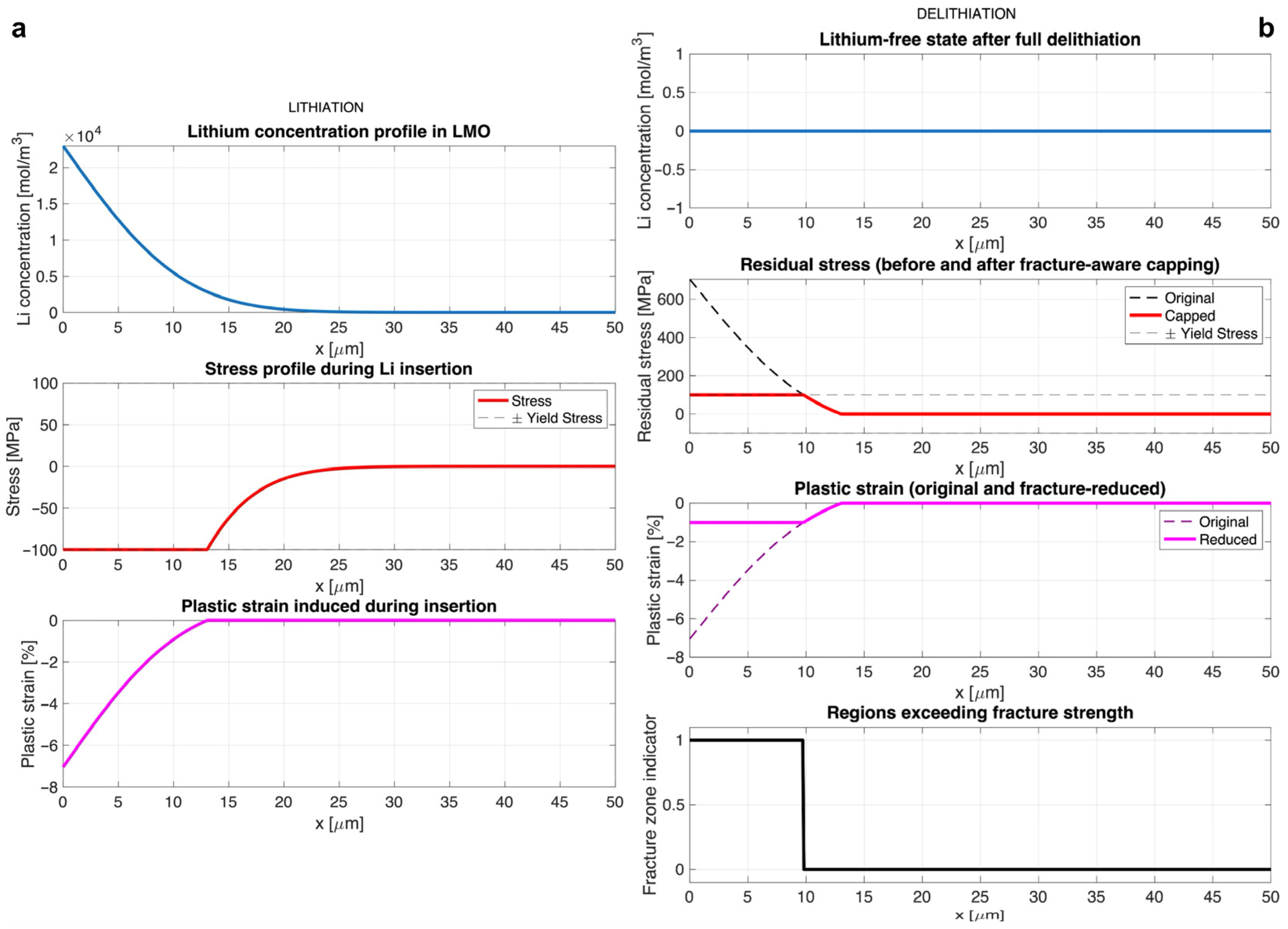 Figure 2b shows the residual stress and retained plastic strain distributions following complete delithiation. As lithium is removed, the chemical strain,