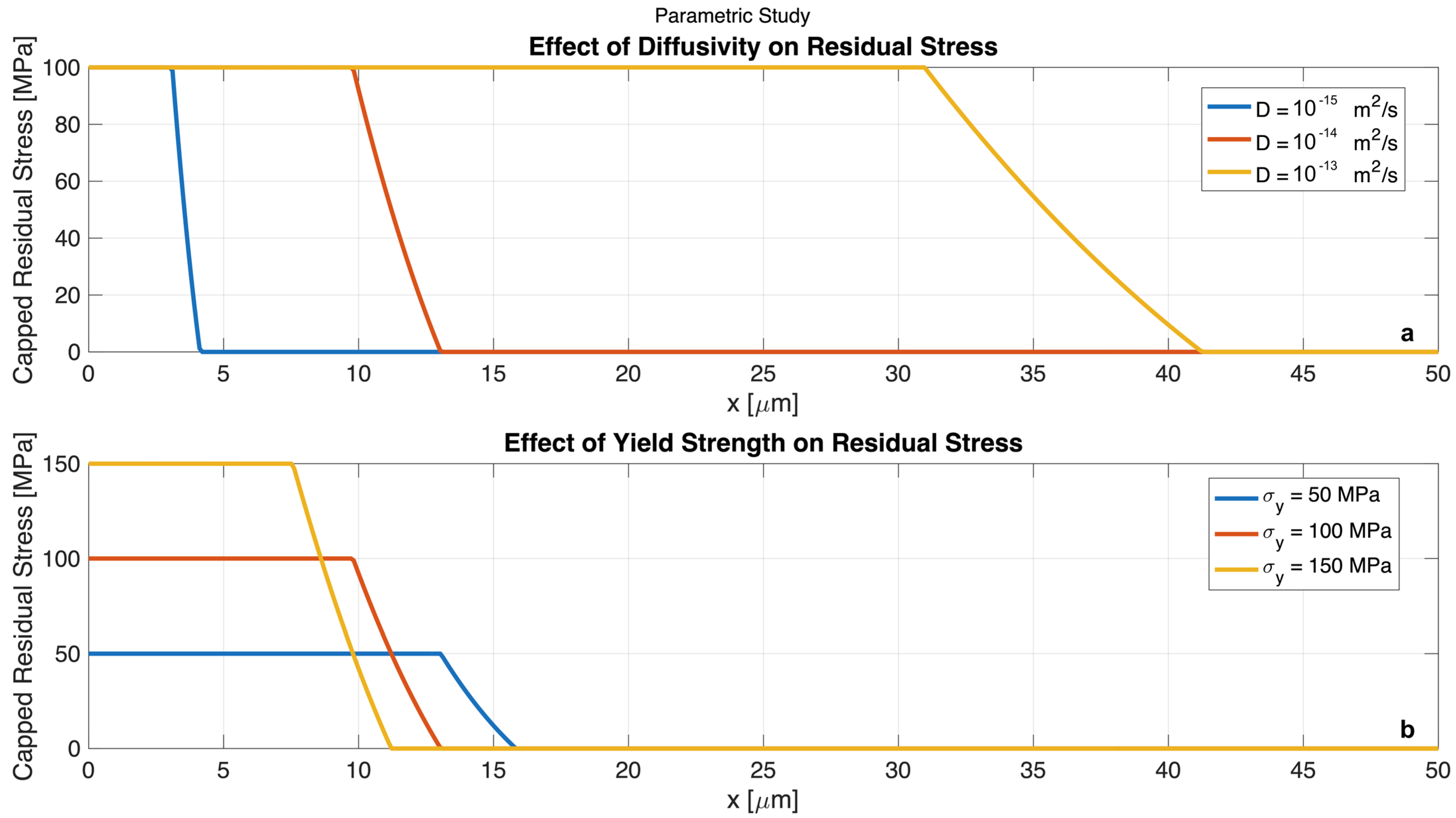 Figure 3b shows the impact of varying the electrode material’s yield strength while keeping diffusivity constant. The analysis reveals that a higher yield strength is highly effective at mitigating mechanical damage. While the peak residual stress is capped by the yield strength itself, a stronger material,