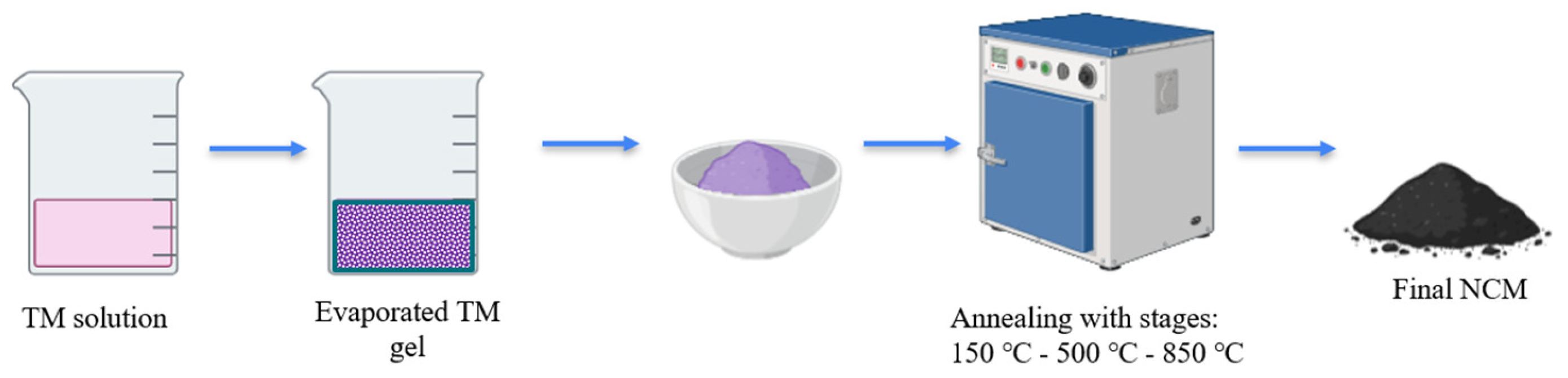 While the sol–gel route offers superior molecular-level homogeneity and more precise stoichiometric control, the resulting loosely aggregated particles lack the engineered secondary-particle architecture required for high tap density, uniform current distribution, and structural durability under cycling. In contrast, spherical secondary particles produced via hydroxide co-precipitation provide improved electrode packing and mechanical integrity, leading to enhanced retention of electrochemical performance over prolonged cycling.