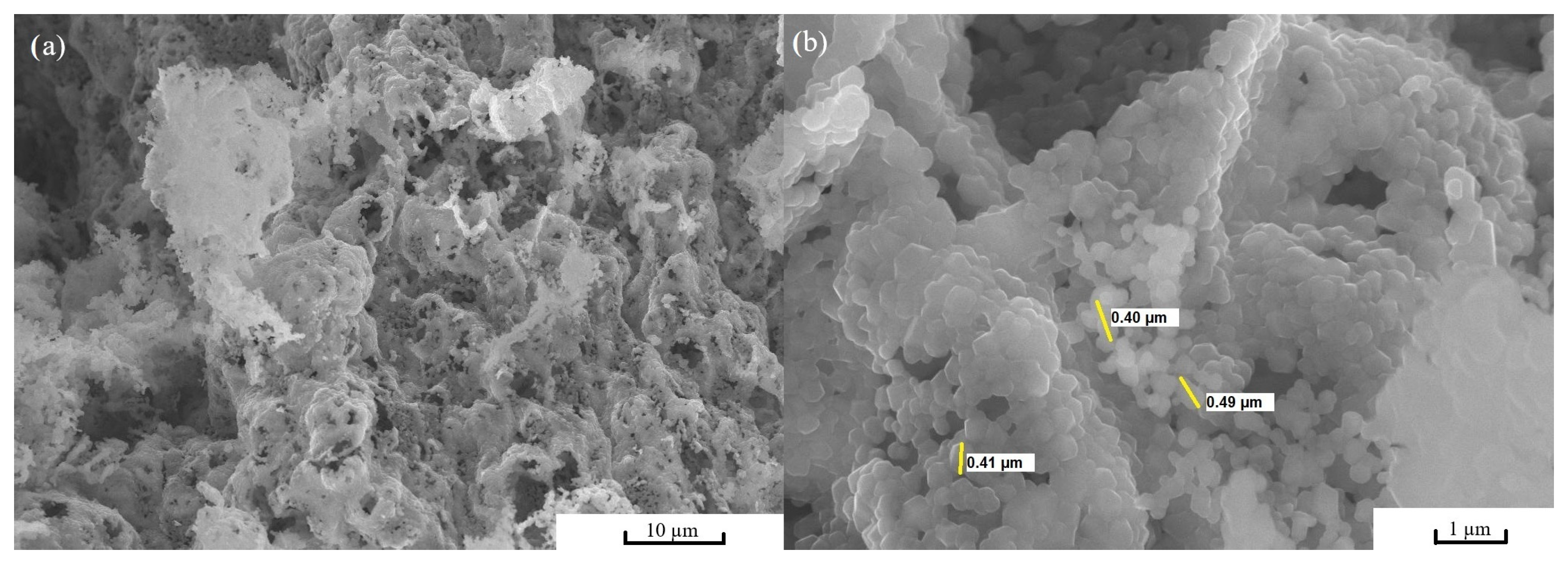 Figure 4a (10 μm scale), the material exhibits a highly porous, continuous network composed of irregular secondary agglomerates. The morphology demonstrates a sponge-like interconnected structure formed during organic binder decomposition and subsequent calcination, which typically accompanies sol–gel processing and leads to extensive internal porosity.