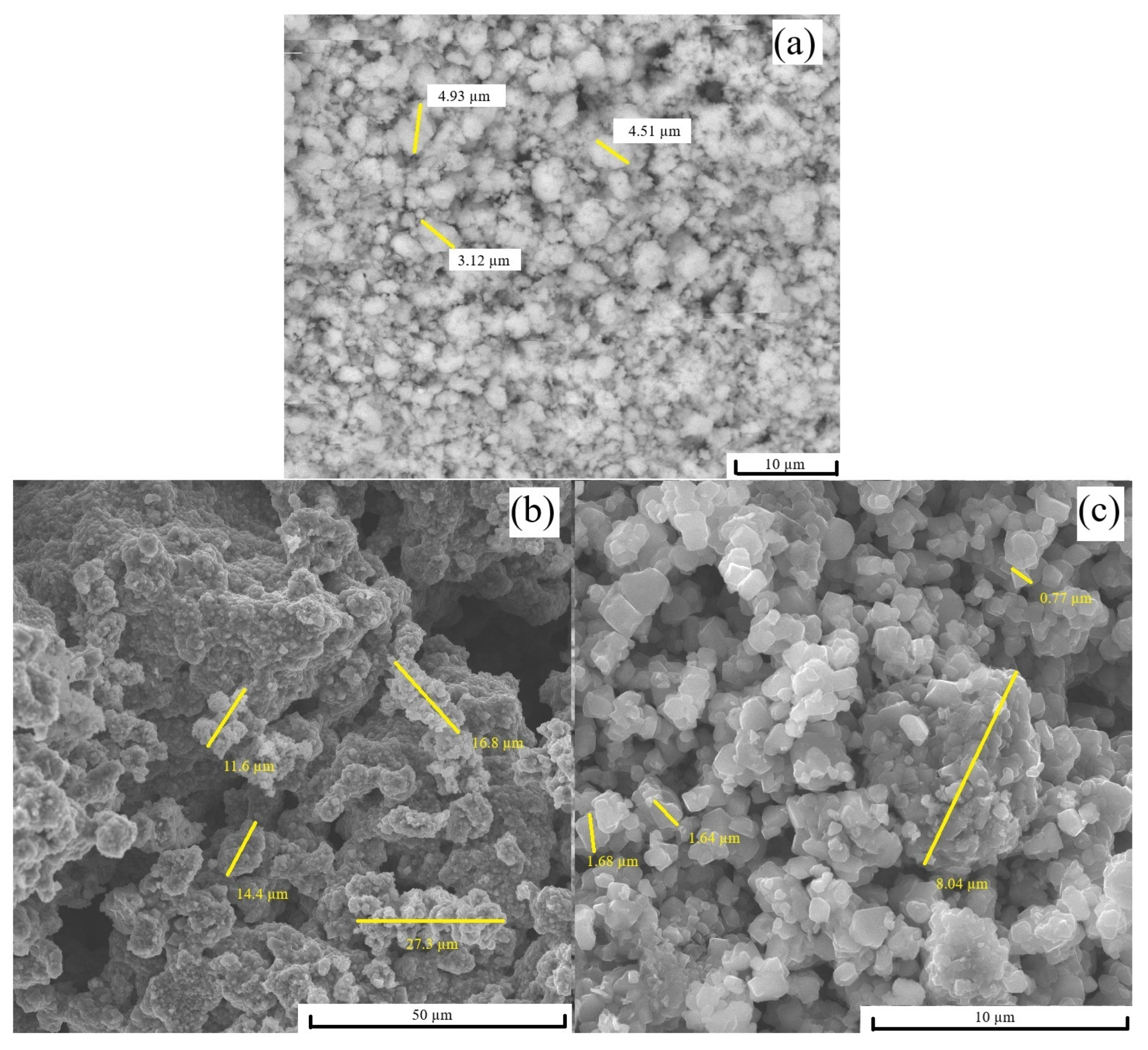 Figure 4b, 1 μm scale) reveals that these secondary structures consist of densely assembled primary particles with sub-micrometer dimensions. The annotated measurements indicate characteristic grain sizes in the range of 0.40–0.49 μm. The particle contacts exhibit neck-type junctions, suggesting partial coalescence during calcination. The fine particle size and hierarchical porosity may enhance electrolyte infiltration and shorten lithium-ion diffusion pathways.