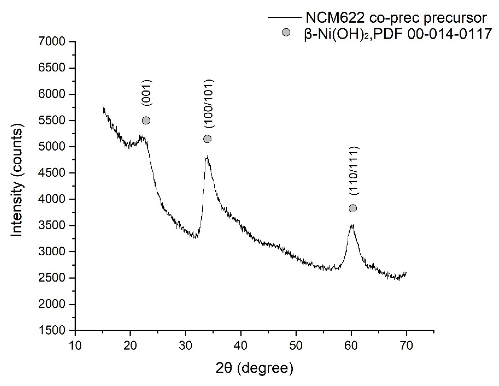 Figure 6 there is a diffractogram of precursor of NCM obtained from co-precipitation approach. The XRD pattern exhibits broad, low-intensity reflections centered at 2θ ≈ 23.5°, 33.4°, and 60.7°, which are assigned to the (001), (100/101), and (110/111) planes of β-Ni(OH)