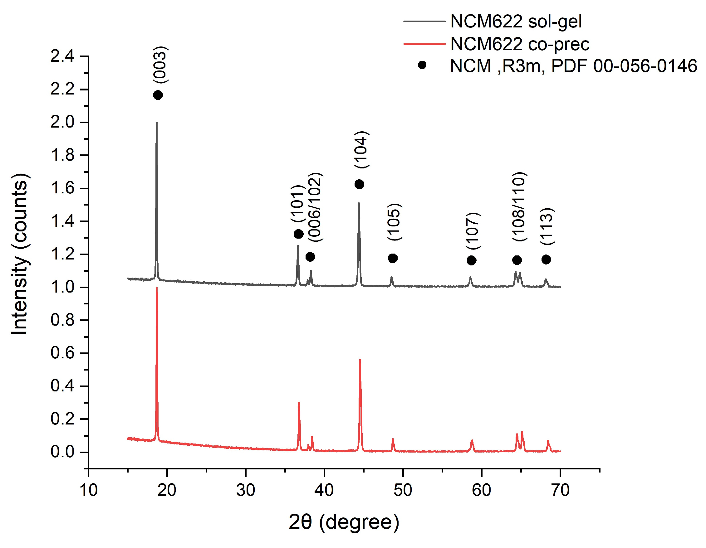 In summary, while both synthesis routes yield phase-pure NCM622 with the desired R-3m symmetry, the sol-gel method produces a more structurally ordered material with reduced cation mixing, as evidenced by the higher I(003)/I(104) ratio and clearer peak splitting. These structural advantages are expected to translate into improved electrochemical performance, particularly in terms of initial capacity, rate capability, and cycle life—even if the co-precipitated material exhibits marginally lower R-factor values.