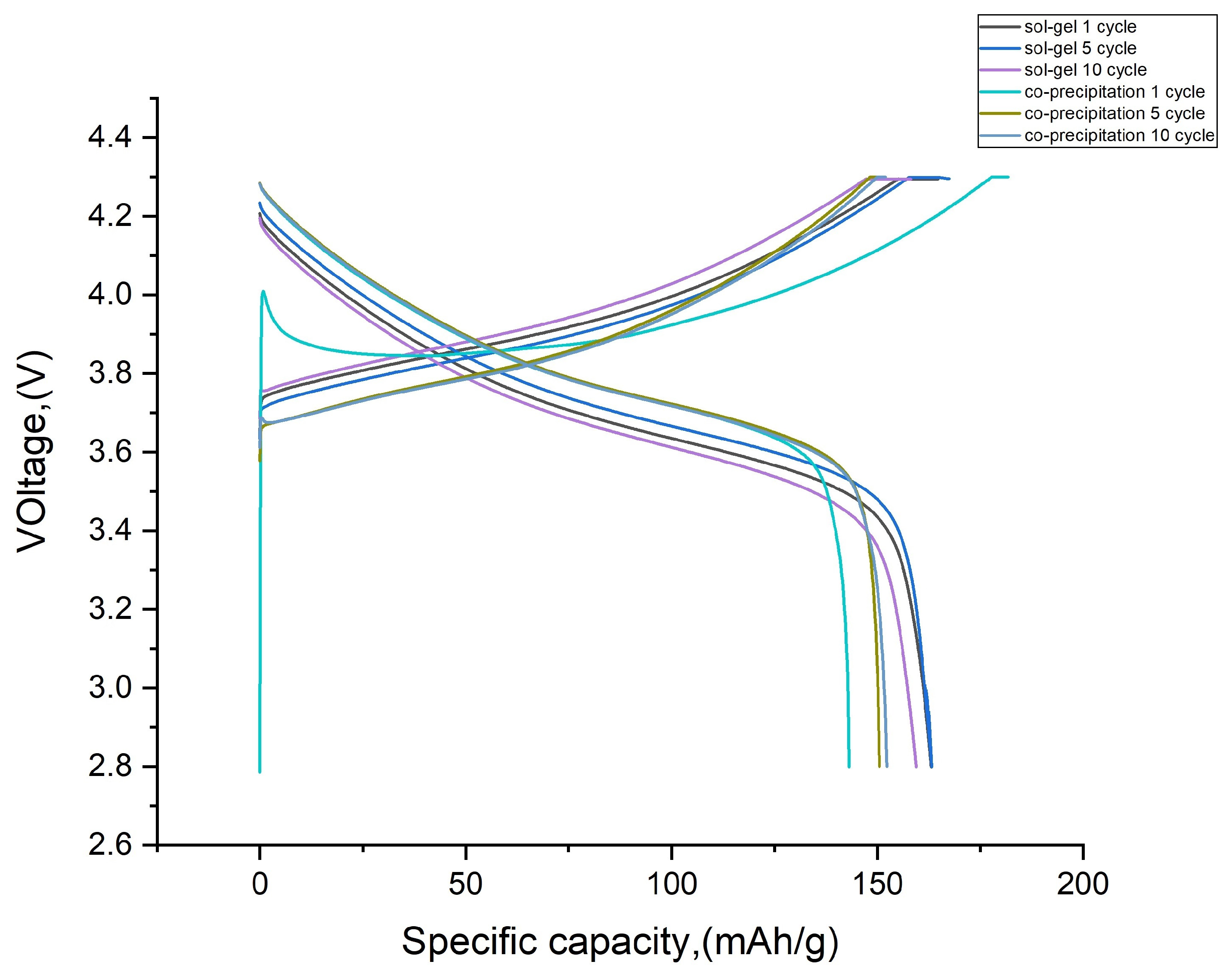 While the sol-gel sample’s CV profile reflects excellent thermodynamics and structural order, the co-precipitated sample’s profile reveals practical advantages: lower polarization, better kinetics, and resilience to degradation—making it more suitable for real-world battery operation despite its off-stoichiometry.