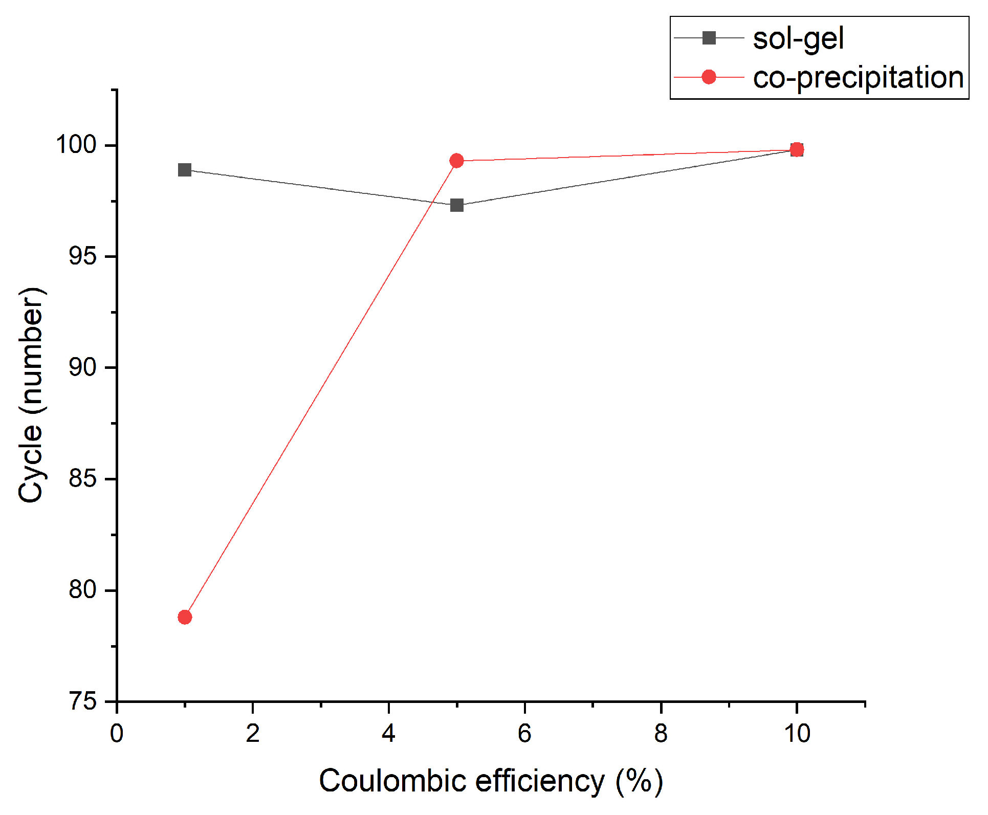 Figure 9. As shown, the sol–gel material maintains a relatively stable Coulombic efficiency near 98–100% throughout cycling, indicating excellent rechargeability and suppressed side reactions. Conversely, the co-precipitation-derived sample exhibits a substantial improvement in Coulombic efficiency after the initial cycle, rapidly increasing from 79% to approximately 98% by the 10th cycle. This behavior suggests that initial structural stabilization and formation of surface passivation layers contribute to performance improvement. The convergence of Coulombic efficiency values for both materials after the first few cycles reveals that although initial losses are higher in the co-precipitated sample, long-term electrochemical reversibility can be effectively stabilized.