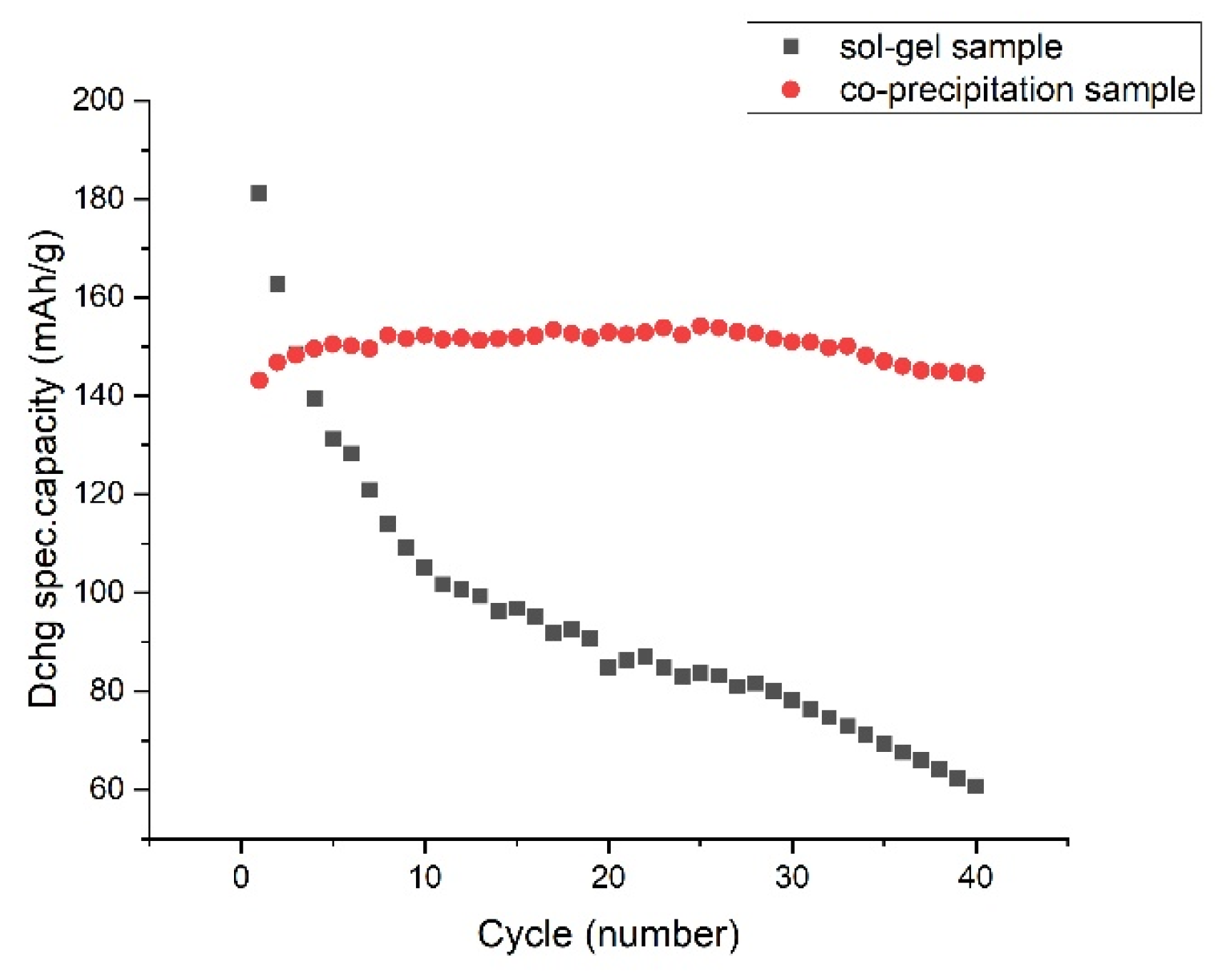 + extraction/insertion. The steep early decay may also reflect incomplete activation or irreversible side reactions at the electrode-electrolyte interface. In contrast, the co-precipitation sample (red circles) demonstrates remarkable capacity stability: after an initial rise (from 145 to 152 mAh/g in cycles 2–5), it maintains a nearly flat plateau (~150–152 mAh/g) until cycle 25, followed by only a moderate decline to ~145 mAh/g by cycle 40, the capacity loss is 3%. This suggests that despite its lower initial capacity and compositional deviation, the co-precipitated material possesses enhanced structural resilience during prolonged cycling—possibly due to its finer particle size and porous agglomerate morphology (observed in SEM), which mitigates mechanical stress and accommodates volume changes more effectively than the denser, larger-grained sol-gel particles.