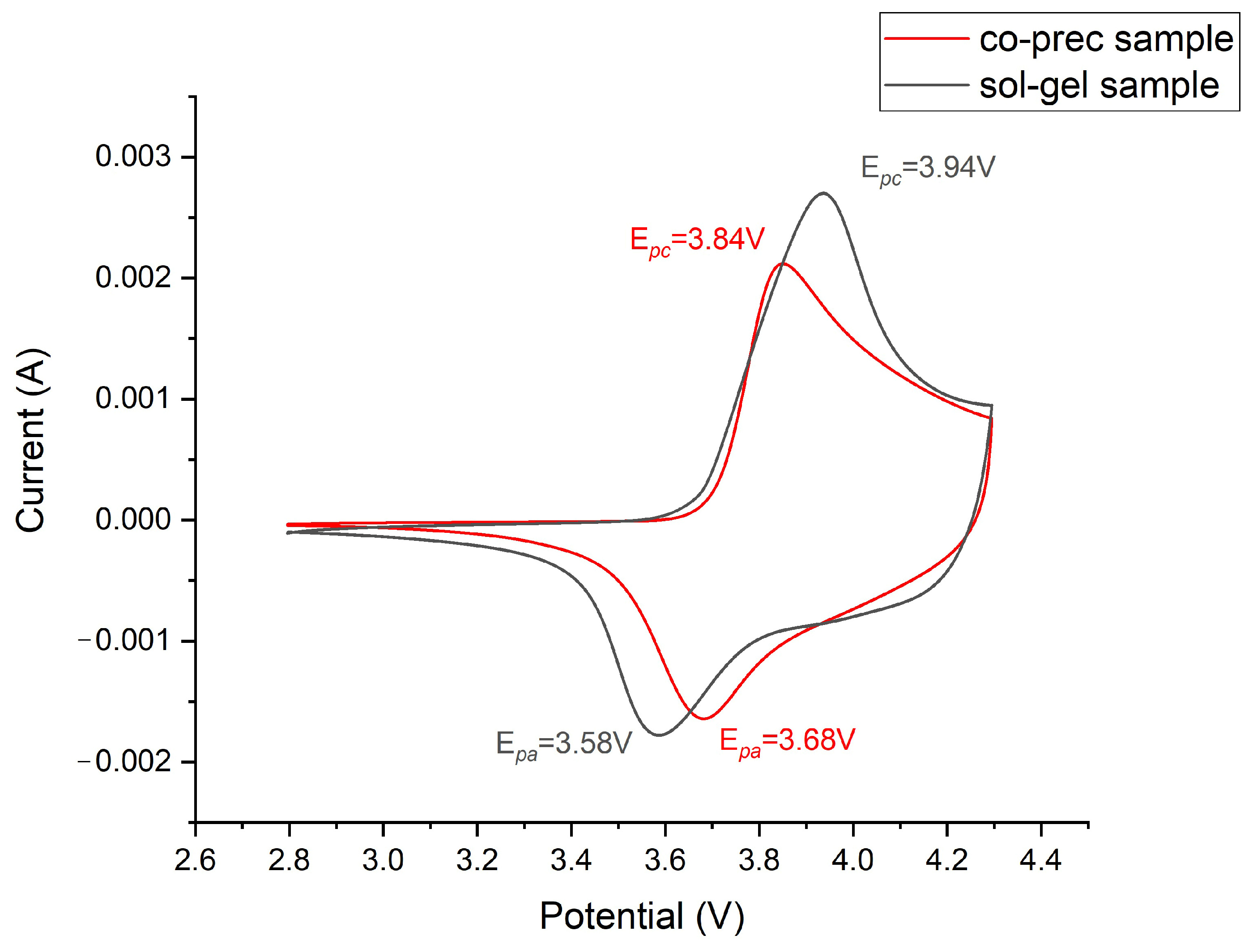 4+ redox couple to slightly higher potentials during oxidation (charge) and lower potentials during reduction (discharge). This explains why the cathodic peak also shifts downward from 3.94 V (sol-gel) to 3.84 V (co-precipitation), indicating easier reduction of Ni