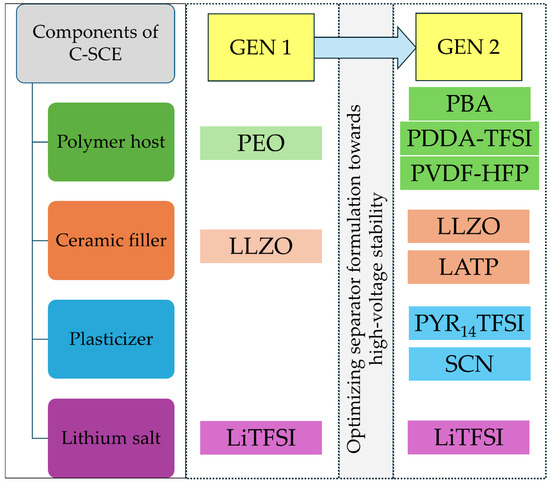 The optimization process of separator formulation for GEN 2 of C-SCEs consisted of a selection of polymer-based matrix and suitable ceramic powders for the matrix. The optimization of the polymeric matrix included the selection of binding polymer, compatible plasticizers, and lithium salt. With PVDF-HFP as the host, two different polymeric matrices were evaluated. The first combination for PVDF-HFP-based separator matrix consisted of PYR14TFSI and SCN as plasticizers and LiTFSI as Li salt. PYR14TFSI [36,37] and SCN [38,39] were chosen due to their reported contributions to improving ionic conductivity, ion mobility, and electrochemical performance in solid polymer electrolyte systems. The second combination consisted of only PYR14TFSI as plasticizing agent and LiTFSI as the Li salt. The two matrix combinations were evaluated to understand the influence of SCN on the overall performance of PVDF-HFP-based C-SCEs. PDDA-TFSI-based separator matrix consisted of PYR14TFSI as plasticizer along with LiTFSI as Li salt. The PBA-based separator matrix consists of LiTFSI as Li salt, without any plasticizers, due to the low molecular weight of PBA compared to that of PVDF-HFP and PDDA-TFSI.