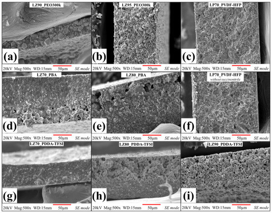 Cross-sectional SEM images of fabricated C-SCEs comparing microstructures of different polymeric matrix groups, starting from PEO-matrix-based separators [32]: (a) LZ90_PEO300k and (b) LZ95_PEO300k; PVDF-HFP-matrix-based separators (c) LP70_PVDF-HFP and (f) LP70_PVDF-HFP without SCN, PBA-matrix-based separators (d) LZ70_PBA and (e) LZ80_PBA, and PDDA-TFSI-matrix-based separators (g) LZ70_PDDA-TFSI, (h) LZ80_PDDA-TFSI, and (i) LZ90_PDDA-TFSI.
