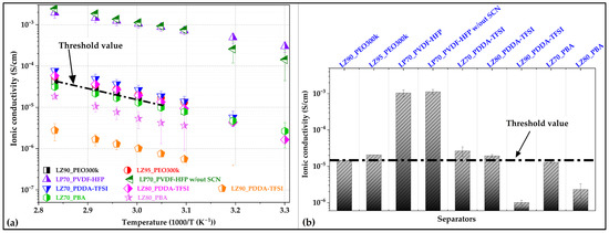 (a) Temperature-dependent ionic conductivity values for all the separators and (b) ionic conductivity of the investigated separators at 60 °C.