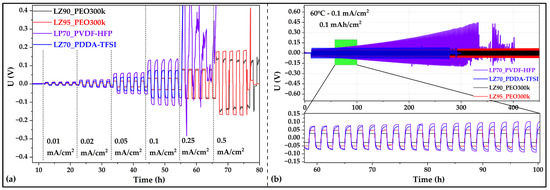 (a) Critical current density test: voltage versus time profiles for different current densities in symmetric Li/Li cells for LP70_PVDF-HFP, LZ70_PDDA-TFSI, LZ90_PEO300k [32], and LZ95_PEO300k [32]; (b) voltage versus time profiles for long-term galvanostatic cycling of symmetric Li/Li cells with LP70_PVDF-HFP, LZ70_PDDA-TFSI, LZ90_PEO300k, and LZ95_PEO300k at current a density of 0.1 mA/cm2 and half cycle step of 1 h with inset showing cycling profile shape of all separators. All measurements were performed at 60 °C.