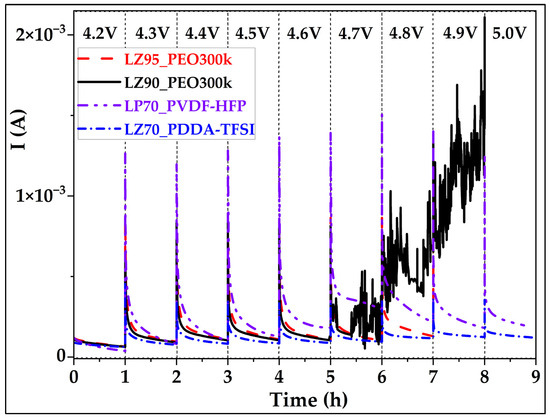 The electro-oxidative stability limit of the separators was evaluated using an electrochemical float test [50] method, taking into account some of the reported limitations of linear sweep voltammetry (LSV). Even though the application of LSV is straightforward, the analysis and explanation of the dataset is still ambiguous and usually overestimates the electrochemical stability limit [51] due to various reported reasons [52,53]. During the float test, charging voltage was kept constant/hold (float) for 1 h and during this time the current was monitored to detect electro-oxidation of the electrolytes. The stability limit for separators was observed from Figure 5 to be 5.0 V for both LP70_PVDF-HFP and LZ70_PDDA-TFSI, and 4.6 V and 4.8 V for LZ90_PEO300k and LZ95_PEO300k [32], respectively. These results demonstrated that the replacement of polymeric matrices from PEO to PVDF-HFP or PDDA-TFSI-based systems improved the overall oxidative stability of ceramic-rich separators.