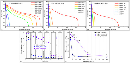 Discharge profiles for discharge C-rate test for Li/NMC622 cells with (a) LZ90_PEO300k, (b) LP70_PVDF-HFP, and (c) LZ70_PDDA-TFSI separators. A summary of the discharge capacity values in Li/NMC622 cells with different separators after cycling (d) versus all cycle numbers to see the evolution of discharge capacity and (e) versus the C-rates used in the test without data from recovery cycle.