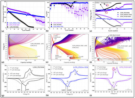 The average voltages of the Li/NMC622 cells with all three separators were analyzed using PROTEO™ Data Analytics V1 (CIDETEC) and shown in Figure 7c. In the graph, there are indications towards degradation in the Li/NMC622 cells with LZ90_PEO300k and LP70_PVDF-HFP due to the increasing difference between the average voltages of charge and discharge. However, in the Li/NMC622 cells with LZ70_PDDA-TFSI, it was observed that the difference between average voltage values was large compared to other systems, which could be due to the higher resistance of the “Li/separator/NMC622” stack and may corroborate the better stability of cells during long-term cycling.
