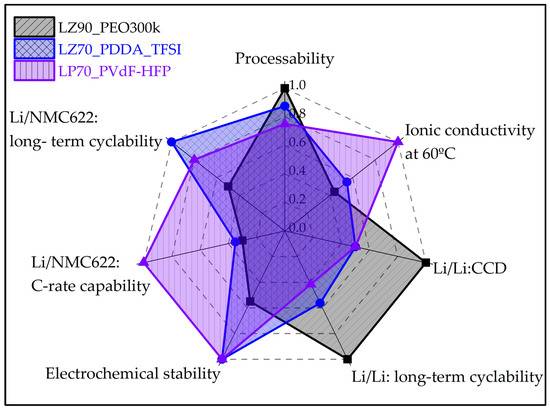 Therefore, separators with 70 wt% of the ceramic content in PVDF, and PDDA-TFSI polymer-based matrices were optimized and evaluated further. The LP70_PVDF-HFP separator was seen to have the highest ionic conductivity at 60 °C, followed by the LZ70_PDDA-TFSI and LZ90_PEO300k separators. Both LP70_PVDF-HFP and LZ70_PDDA-TFSI separators with dense microstructure were evaluated for their stability against lithium metal and high-voltage Li/NMC622 cells.
