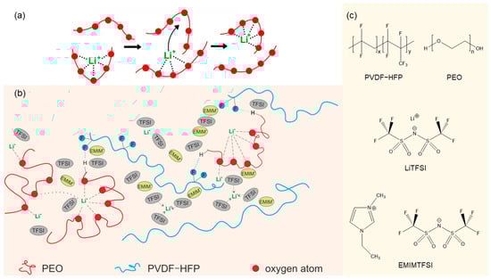 (a) Transport mechanism of lithium cations along PEO chains. The figure was adopted from Meyer [41]. (b) Schematic representation of lithium-ion transport in the ternary PVDF-HFP, PEO, LiTFSI, and EMIMTFSI polymer electrolyte system. (c) Structure of single components PVDF-HFP, PEO, LiTFSI, and EMIMTFSI.