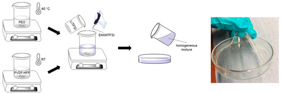 The ternary polymer electrolytes were prepared using the casting method (Figure 2). The electrolytes consist of the following components: PEO (Mw = 400 000 g/mol (Sigma Aldrich, St. Louis, MO, USA), PVDF-HFP (Mw = 400 000 g/mol, Sigma Aldrich), conducting salt LiTFSI (>99%, Ossila, UK) and ionic liquid EMIMTFSI (>99%, Ionic Liquid Technologies, Heilbronn, Germany). The mass ratio between polymer, Li-salt and IL corresponded to 1:1:1. Depending on the selected composition, mass proportions of PEO and PVDF-HFP were varied. The prepared and investigated compositions of the ternary polymer electrolytes (yPEO/zPVDF-HFP):LiTFSI:EMITFSI (y, z in wt-%) are listed in Table 1. Both polymers were dissolved separately in acetone (99%, VWR Chemicals, Darmstadt, Germany), with PEO representing a viscous solution at 40 °C, and PVDF-HFP at room temperature. The Li-salt and IL were then added and stirred at 40 °C until a homogeneous viscous mixture was obtained.