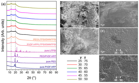 (a) XRD patterns of pure components PVDF-HFP, PEO, LTFSI, polymer blend PEO/PVDF-HFP (1:1), mixtures of PEO/LiTFSI/EMIMTFSI (1:1:1) and PVDF-HFP/LiTFSI/EMIMTFSI (1:1:1), and ternary polymer electrolytes tPE PEOyPVDF-HFPz, recorded with Cu-Kα1 radiation; (b–f) SEM pictures of: (b) pure PEO, (c) pure PVDF-HFP, (d) polymer blend PEO/PVDF-HFP (1:1), (e) tPE PEO25PVDF-HFP75, (f) tPE PEO50PVDF-HFP50.