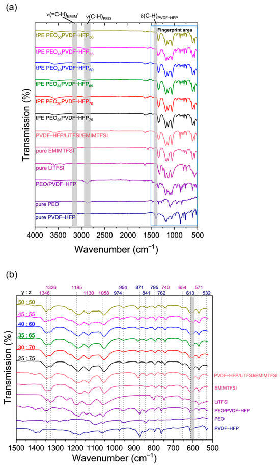 The interactions in the polymer electrolyte can be followed up using FT-IR spectroscopy, with the intensities and shifts of spectral features being interpreted. Figure 4 shows the measured vibrational spectra for all investigated polymer electrolyte compositions: ionic liquid EMIMTFSI, the lithium salt LiTFSI, pure polymers, and the polymer mixture in the wavenumber range of 4000–500 cm−1.