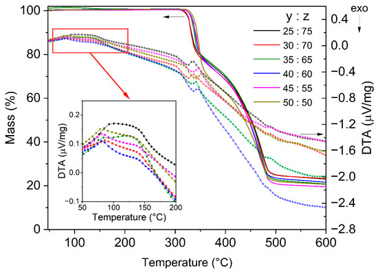 The first mass loss of the ternary polymer electrolytes occurs at around 320 °C, which is visible in the TG curve, followed by the second one at 350 °C. According to Xue et al. [26], structural decomposition of PEO with a mass loss takes place at 194 °C, of PVDF-HFP at 388 °C, and of LiTFSI at 356 °C. EMIMTFSI is thermally stable up to 358 °C [48]. Therefore, the decomposition process results from contributions of all components. The mass loss between 320 °C and 350 °C is about 20% for almost all electrolyte compositions, with the exception of the polymer electrolyte tPE PEO50PVDF-HFP50, which shows a higher value of 28%. Presumably, this electrolyte is thermally less stable than other compositions due to the large amount of PEO. Decomposition of polymers is accompanied by a strong endothermic signal. This is caused by a combination of the decomposition processes of the CF3 groups of the PVDF-HFP, ethyl and methyl groups from the imidazolium ring and chain scission of the PEO. The second stage, representing the main decomposition process of the entire structure of the polymer electrolytes, takes place in the temperature range from about 350 °C to 490 °C. Thereby, an endothermic DTA signal is visible here as well.