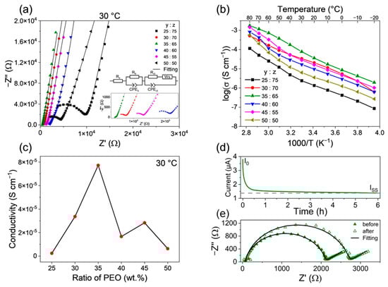 (a) Nyquist plots of polymer electrolytes tPE PEOyPVDF-HFPz at 30 °C and the equivalent circuit model with Rs—series resistance, Rb—bulk resistance, Rct—charge-transfer resistance, CPE—constant phase element, Ws—Warburg short element; (b) Ionic conductivity of polymer electrolytes as a logarithmical plot against temperature; (c) Relationship between ionic conductivity and mass ratio of PEO in the ternary electrolyte; (d) Chronoamperogram of tPE PEO35PVDF-HFP65 at 25 °C, and (e) its Nyquist plots before and after polarisation at 25 °C.