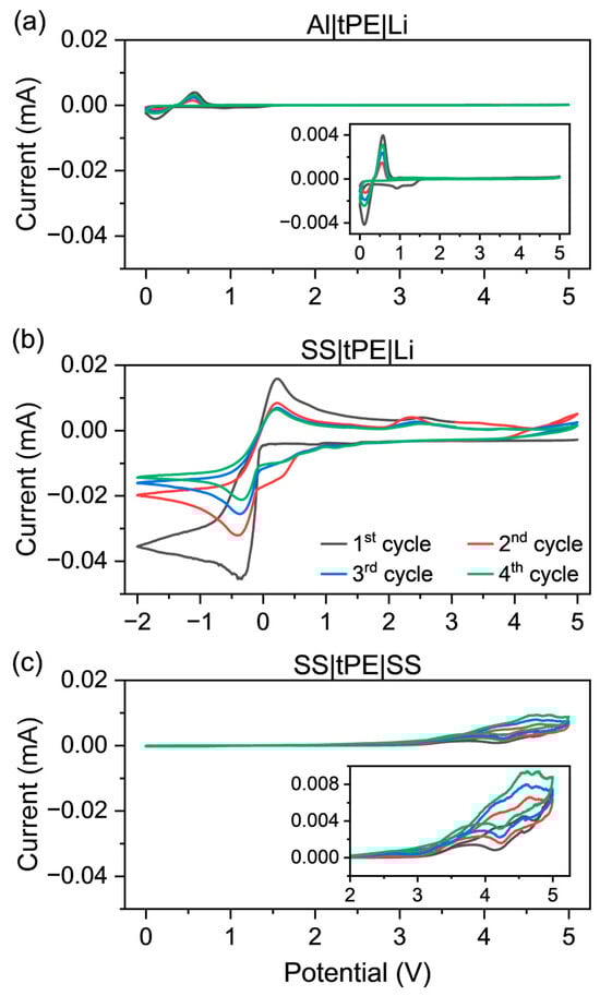 For the Al/tPE/Li cell (Figure 7a), a noticeable redox process takes place in the first cycle. This could be caused by the fact that EMIMTFSI is not stable at potentials below 1 V [37]. Starting from the second cycle, the polymer electrolyte system has wide electrochemical stability between 1 V to 5 V. In addition, a Li–Al alloy can form at the potential below 0.5 V. Figure 7b represents the asymmetrical cell configuration with a stainless steel chip at the cathode and lithium chip at the anode. In the first scan, the Li deposition and stripping appear at −0.36 V and 0.22 V. However, some irreversibility and a comparatively smaller peak upon Li stripping are observed due to the redox instability of the EMIM+ cations (similar to the case in Figure 7a), which affect the formation process of the solid–electrolyte interface [53]. After the initial cycle, the system exhibits reversibility, but a small peak is observed at 2.4 V, which may be an undesirable reaction between the stainless steel and lithium interface. Figure 7c shows wide electrochemical stability between 0 V and around 4 V in the symmetrical cell configuration with the stainless steel electrodes.