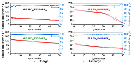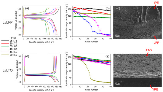 In the first cycle, both half cells with LFP and LTO show a relatively high capacity, which is close to the theoretical value (170 mAh g−1 for Li/LFP, and 175 mAh g−1 for Li/LTO cells). Note that the capacity values in Li/LFP cells do not follow the composition dependence of the ionic conductivity. Thus, the Li/LFP half cells with the lower mass fraction of PEO tend to have a higher specific capacity, except for the tPE PEO35PVDF-HFP65 composition. The cell polarisation, defined as a difference in potentials between the charge and discharge curve at half of the capacity value of the Li/LFP cells, is the lowest for 25% PEO:75% PVDF-HFP, at 165 mV, and increases to 489 mV at higher PEO mass fractions. Considering cycle stability, the discharge capacity of the compositions PEO:PVDF-HFP = 25:75, 35:65, and 50:50 showed around 92% after 50 cycles, compared to the discharge capacity of each composition in the first cycle. Here, the question may arise again of why the long-term performance is not in accordance with the dependence of the ionic conductivity on the polymer electrolyte composition. While the polymer compositions PEO:PVDF-HFP = 25:75, 30:70, 35:65, and 50:50 showed good stability, the discharge capacities of PEO:PVDF-HFP = 40:60, and 45:55 reduced significantly after 50 cycles. Thus, the discharge capacities were only about 7% and 3.4% of their discharge capacities in the first cycle. A possible explanation for this random relationship and the strongly decreasing capacity could be weak mechanical stability of the LFP electrode–electrolyte interface, leading to contact loss of LFP particles, either to the current collector or to the polymer electrolyte surface due to the volume change in the LFP structure during the lithiation and delithiation. Indeed, LiFePO4 undergoes a two-phase transformation with the Li-free FePO4 phase, having a 7% smaller unit cell volume [54]. The interface between the polymer electrolyte and LFP, shown in Figure 7c, features some cracks in the LFP electrode. These areas are definitely less active in the electrochemical process.