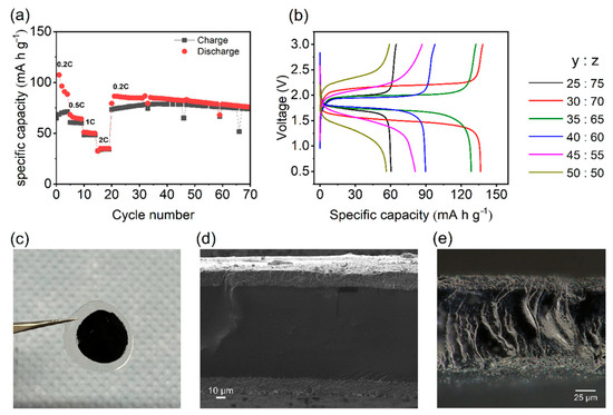 Figure 9b represents the first cycle of the full cell LTO/LFP with the polymer electrolytes under investigation at 25 °C. The highest specific discharge capacity was 137 mAh g−1, measured for the tPE PEO30PVDF-HFP70 composition. However, this electrolyte composition has a large internal resistance, which can be deduced from the cell polarization of 830 mV. The second-best specific discharge capacity belongs to the polymer electrolyte with a 35% PEO and 65% PVDF-HFP mass ratio. This composition achieved a discharge capacity of 129 mAh g−1, and the corresponding cell polarisation was 640 mV. The electrolyte compositions at y:z = 40:60 and 45:55 reached only about half of the theoretical value. The polymer electrolytes with tPE PEO25PVDF-HFP75 and tPE PEO50PVDF-HFP50 compositions achieved similar specific capacities of only around 60 mAh g−1. However, there were differences between the electrolytes with 25% PEO and 50% PEO concerning polarisation. Furthermore, it is noticeable that the specific capacities decreased with increasing amounts of PEO. The large addition of PEO increases the crystalline part of the entire electrolyte system at room temperature, which limits the ionic transport. To better illustrate how the sandwich of the investigated ternary polymer electrolytes looks after electrochemical measurements, the battery cell with tPE PEO35PVDF-HFP65 after disassembling is shown in Figure 9c. Here, the mechanical integrity of the layers is preserved. This sandwich was also studied under SEM (Figure 9d) and optical microscopy (Figure 9e).