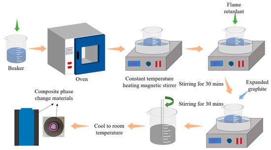 Firstly, the flame retardant is prepared by mixing APP, CS, and AHP in a mass ratio of 2:2:1 until uniform. Secondly, a certain amount of PA is placed in a beaker, and the beaker containing the PA is placed in an oven at 90 °C for 30 min until it melts. Then, the beaker containing the PA is placed in a magnetic stirrer with the temperature set to 90 °C. A flame retardant with a mass ratio of x (x = 0, 9, 12, 15, 18, 21%) is added and stirred for 30 min to ensure uniform mixing of the PA and flame retardant. Subsequently, EG with a mass ratio of 5% is added and stirred for another 30 min to ensure uniform mixing of the PA, flame retardant, and EG. Finally, the prepared flame-retardant CPCM is cooled at room temperature and pressed into a mold. Figure 1 illustrates the preparation method of the samples. Table 2 shows the composition of the flame-retardant CPCM.