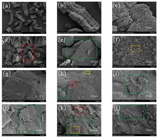 SEM morphology (a–c) EG; (d) APP; (e) AHP; (f) CS; (g) M1; (h) M2; (i) M3; (j) M4; (k) M5; (l) M6.