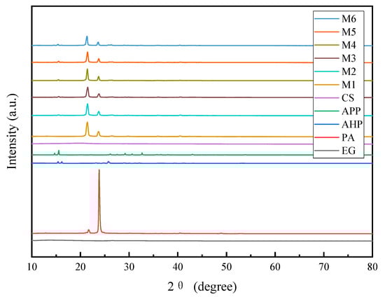 The XRD results are shown in Figure 4. PA exhibits significant diffraction peaks at 21.71° and 23.83°, while EG shows a peak at 26.59°. AHP has diffraction peaks at 15.39°, 16.12°, and 26.17°, and APP displays a peak at 15.59°. Notably, M1 shows the same diffraction angles as PA, EG, APP, and AHP, with no additional peaks. Similarly, M1–M6 all display diffraction peaks at the same 2θ values. However, as the PA ratio decreases, the peaks at 21.45° and 23.77° gradually weaken. This can be attributed to the dispersion of granular IFR in PA, which impacts the crystallinity of PEG. Importantly, no new diffraction peaks were observed for any of the CPCMs, indicating that the synthesis of the PCM involved only physical mixing, with no chemical reactions occurring.